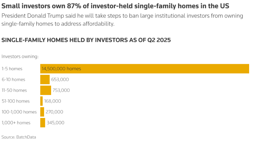 Trump announced a ban on large funds buying single-family homes, which temporarily knocked around $17 billion off Blackstone's market capitalization, but the "mega" funds themselves account for only about 2-3% of all transactions in the single-family home market, which means that removing this segment of demand will not significantly change prices, as the main problem in the market is very low supply resulting, among other things, from existing investor ownership and high interest rates.