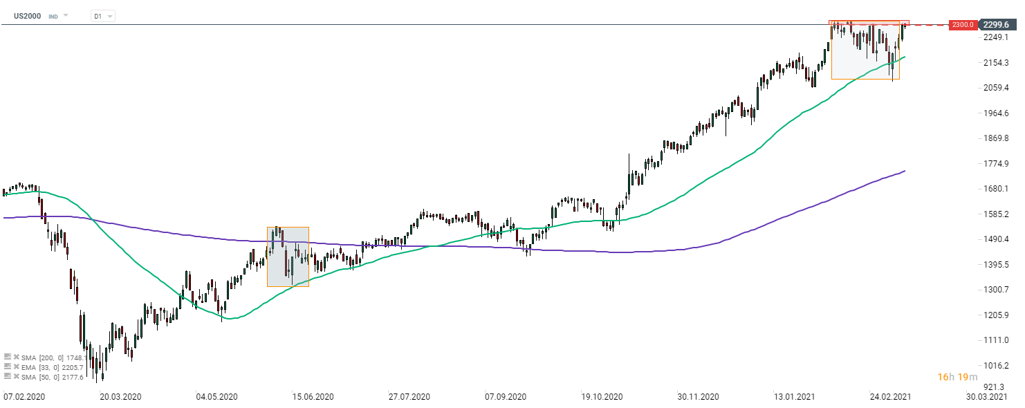US value stocks and small-caps caught a bid yesterday and outperformed the tech sector. US200 climbed 1.8% and approached the 2,300 pts resistance zone. Area is marked with all-time highs from early-February 2020. Source: xStation5