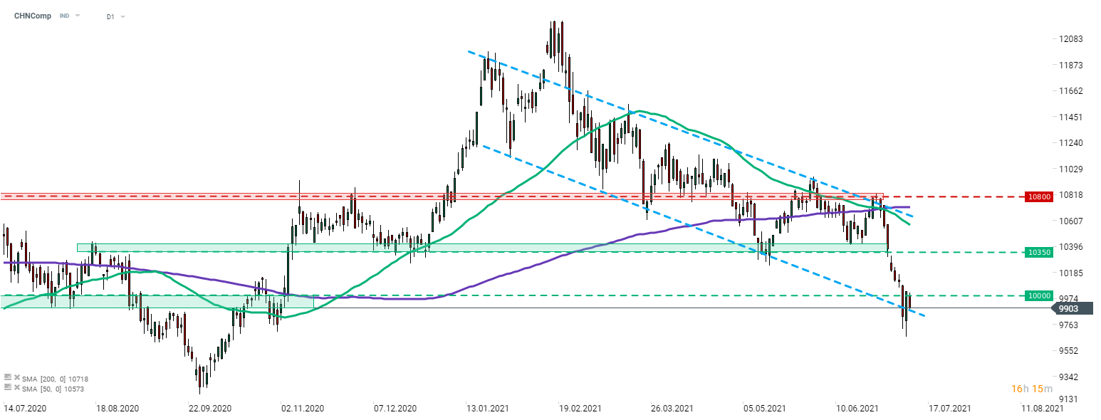CHNComp is one of the few Chinese indices that fails to benefit from upbeat moods and lags today. Nevertheless, the index continues to trade above the lower limit of the downward channel following an unsuccessful break attempt at the end of the previous week. Source: xStation5