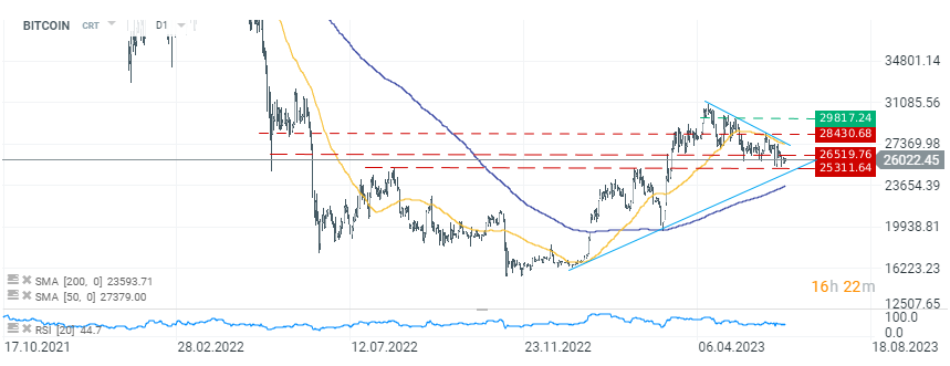 Bitcoin is currently consolidating within a range of 25,300 to 26,000. The key support level is at 25,300, which has shown significant reactions in the past few months. If the bullish momentum fails to sustain this level, a potential further decline may be expected, D1 interval, source xStation 5.