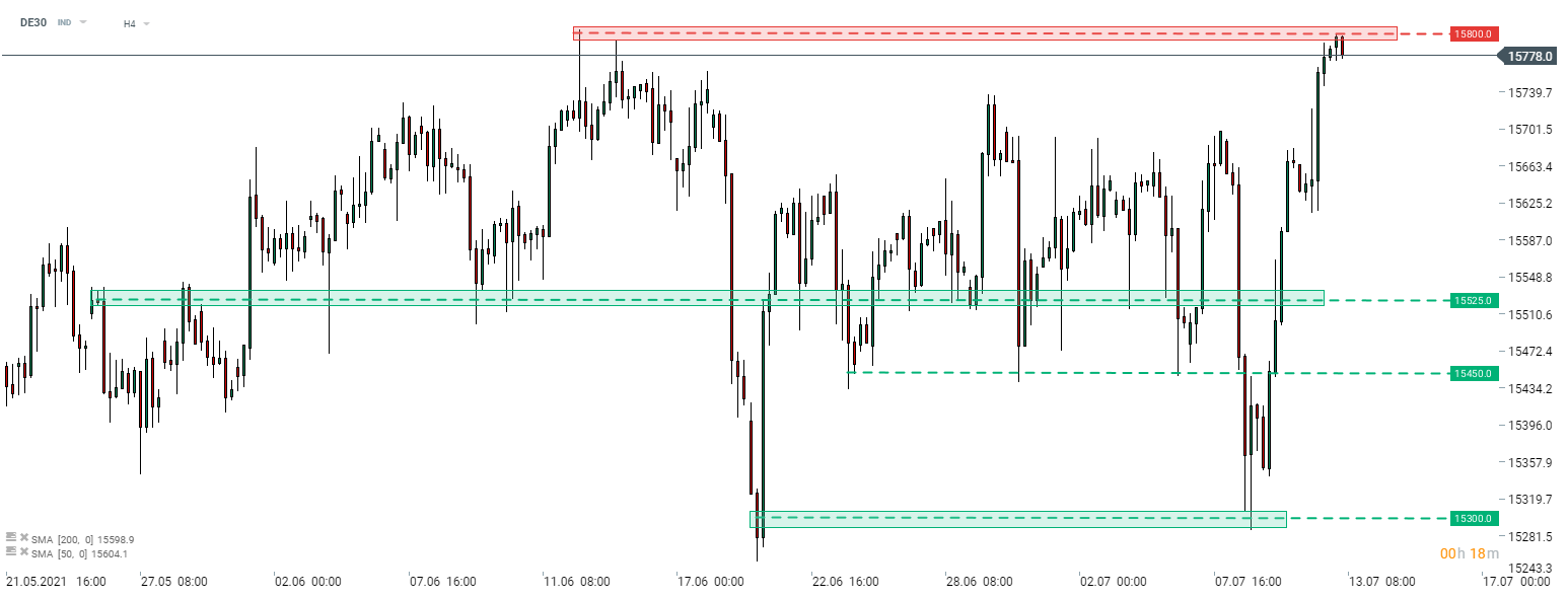 DE30 extended upward move and tested all-time highs in the 15,800 pts area. The index was unable to break above this zone but continues to trade nearby. Source: xStation5