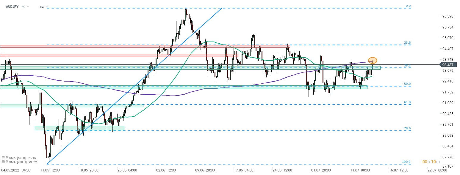 AUDJPY leaped higher today. Gain is fuelled mostly by solid showing of AUD, thanks to strong jobs report for June. However, JPY weakness also plays a role. The pair tested 200-period moving average (purple line, H4 interval) earlier today but failed to break above. Source: xStation5