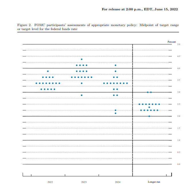 After hiking by 75 bp, the Fed communicates 175 bp moves over the next 4 meetings this year. Source: federalreserve.gov