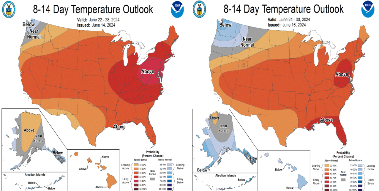 Pullback on the US natural gas market (NATGAS) extended into a new week. NATGAS launched new week's trading with a bearish price gap and continued to move lower. US natural gas prices are down almost 4% on the day and move back below $2.80 per MMBTu for the first time in almost 2 weeks. New weather forecasts from US National Oceanic and Atmospheric Administration (NOAA) can be named as a reason behind the drop today. New forecast (right side on the chart below) point to lower probability of above-average temperatures in key Midwest region over the next 8-14 days, compared to pre-weekend forecast (left side on the chart below). However, it should be noted that new forecast still suggest an over-50% chance of above-average temperatures occurring.