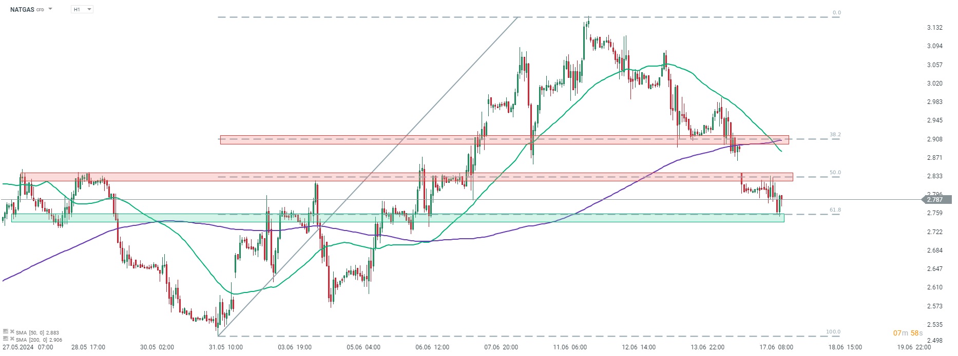 Taking a look at NATGAS chart at H1 interval, we can see that price dropped and tested short-term support zone marked with the 61.8% retracement of the upward impulse launched at the turn of May and June 2024. So far, buyers managed to defend this hurdle and a small bounce off the area occurred. However, price remains down almost 4% on the day.