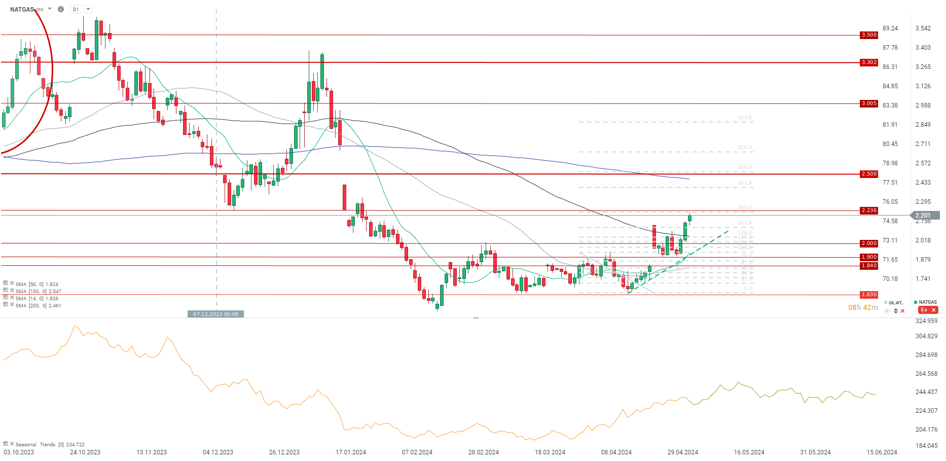 NATGAS rebounded to its highest levels since January 26th. Moreover, the recent candles suggest a return of greater volatility, which may indicate that in the coming weeks, in line with seasonality, we will see a rebound even to the range of 2.5 USD/MMBTU, where the 200-period moving average is located. Seasonality indicates that buying pressure should persist until mid-month.