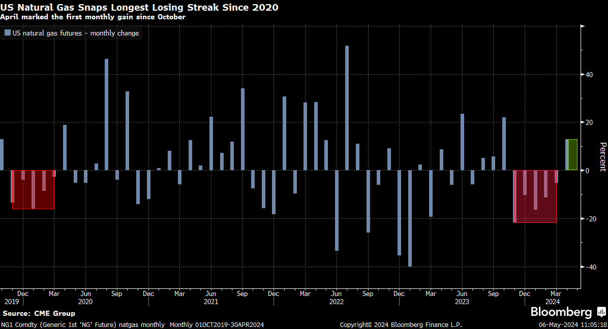 April was the first month of gains for US natural gas prices (NATGAS) since October last year. The earlier period from November to March was the longest period of declines in at least 4 years. Gas remained at a low level due to the sustained high production and low demand during the heating season in the US. However, the situation is starting to change now.
