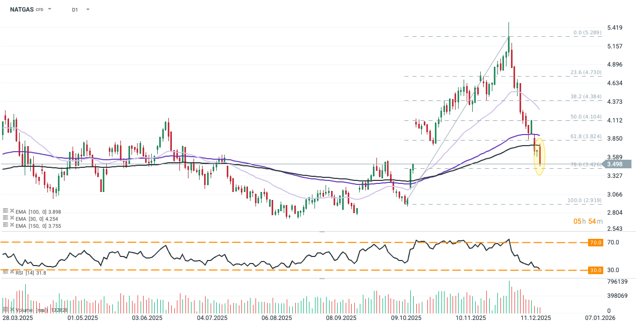 Natural gas futures on NYMEX are plunging by around 5.5% in response to record-high production and warmer weather forecasts in the United States. NATGAS has fallen roughly 28% since the beginning of the month, with this dual pressure accelerating the return of prices to early-autumn levels.