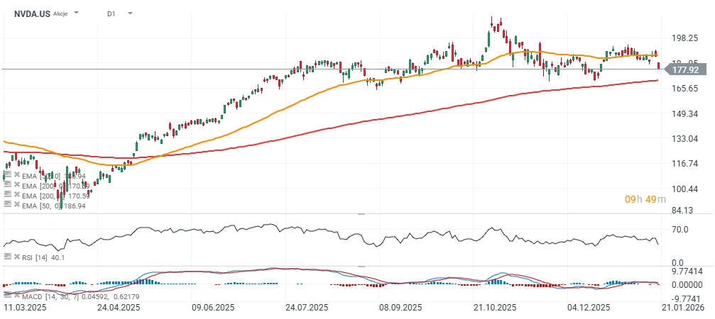 - That would also imply a test of the 200-day EMA (red line). The pattern’s projection suggests Nvidia could break below both the EMA200 and the neckline, potentially flipping the broader trend. In that scenario, a key longer-term support level could emerge around $135 per share, reinforced by the consolidation zone from late May and early June last year.