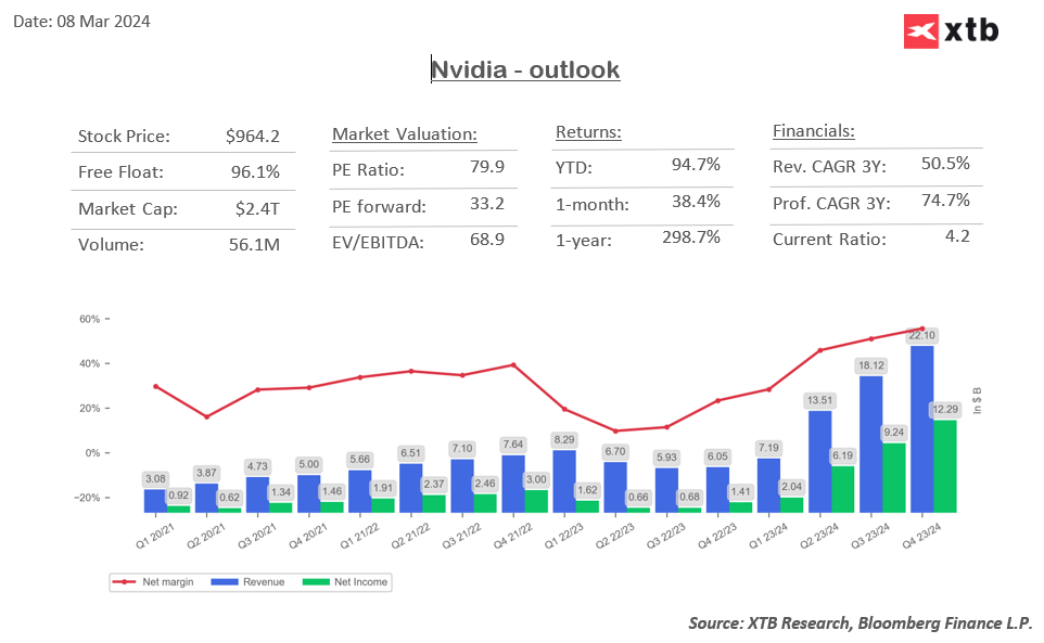 The company currently boasts revenues of more than $20 billion per quarter, but given that the AI chip market is expected to be worth more than $250 billion in three to five years, and Nvidia still owns the lion's share of that market, high valuations don't seem like much at all. The company presents a relatively low forward PE of around 33. Source: Bloomberg Finance LP, XTB