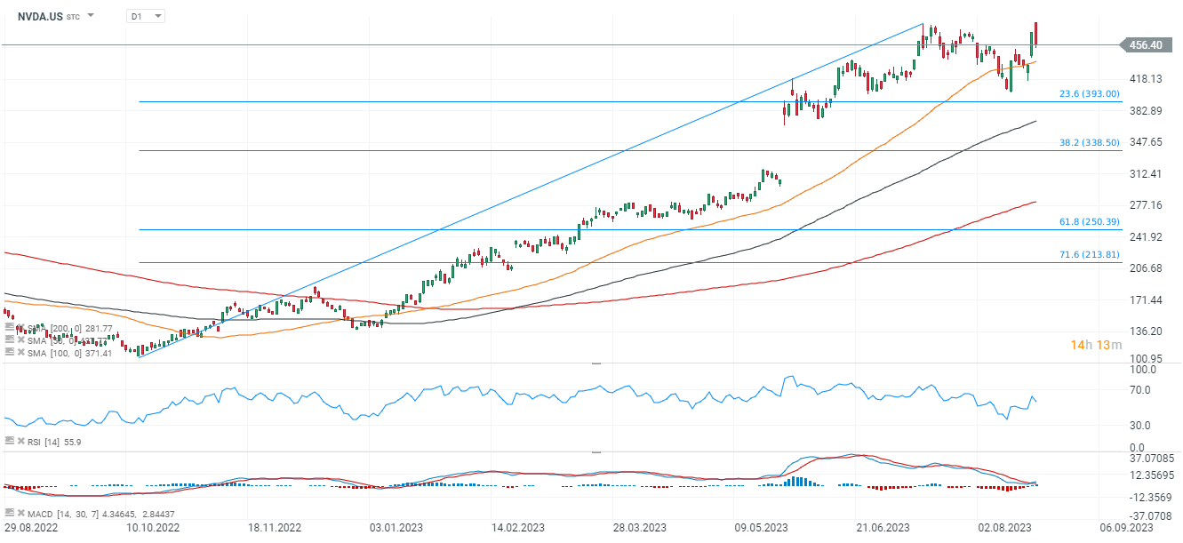 For Nvidia shares, therefore, the stronger the results from Data Center, the better. If they will be strong enough, they can 'mask' any weakness in other segments. Industry technology portals point out that demand for AI A100 and H100 chips is powerful, and the company is only able to meet half of it. As a result, the price of the H100 has risen 100% from its initial $20,000. The trend could theoretically last for many quarters (until the market is saturated) although the question mark for its momentum remains a possible recession.