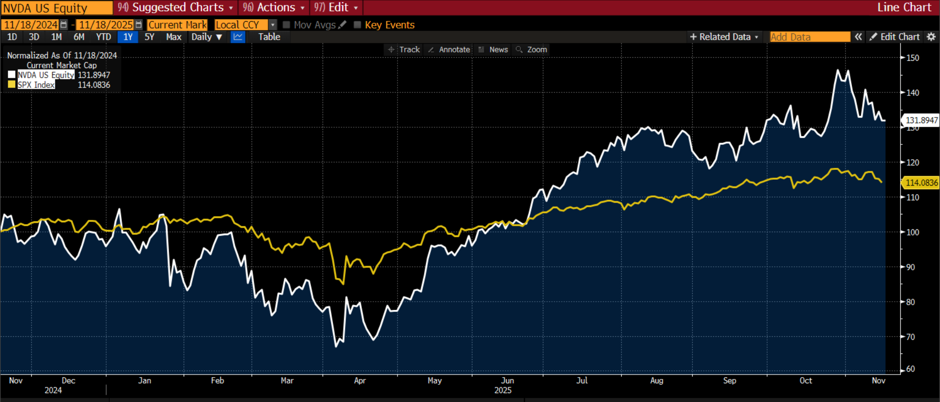 Chart 1: Nvidia’s market capitalization growth has outpaced the overall S&P 500’s market capitalization growth, as the company has become more important to the overall US market.