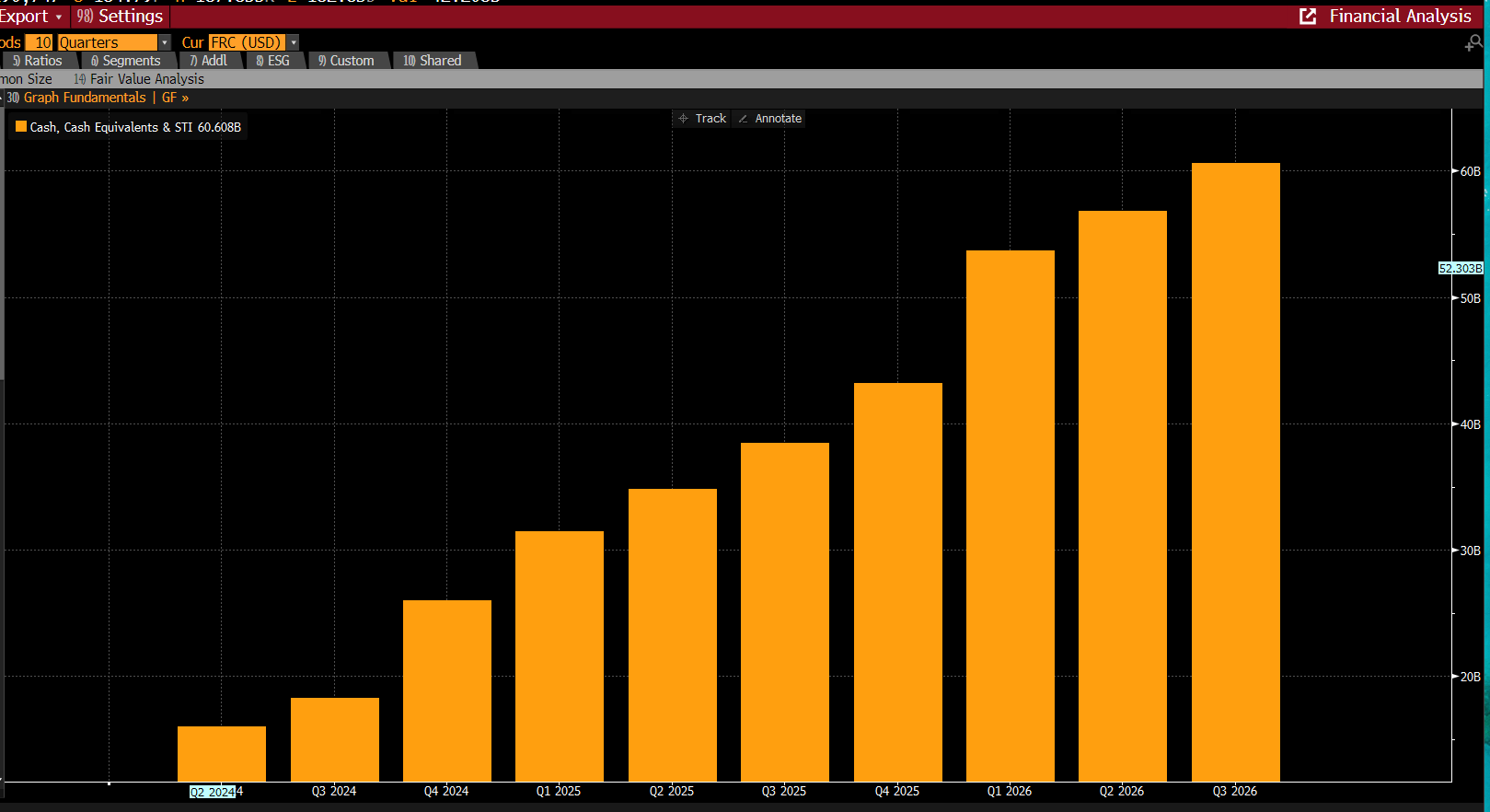 This company is a cash generating machine, it has $60.6bn of cash and cash equivalents on its balance sheet, up from $38.4bn a year ago. To put this into context, Apple has $54.69bn in cash and cash equivalents on its balance sheet. However, more important for Nvidia is the amount of cash Microsoft has on its balance sheet. It reported cash and cash equivalents of more than $102bn last quarter, which suggests that Nvidia’s single largest customer can well afford a long-term AI build out programme.