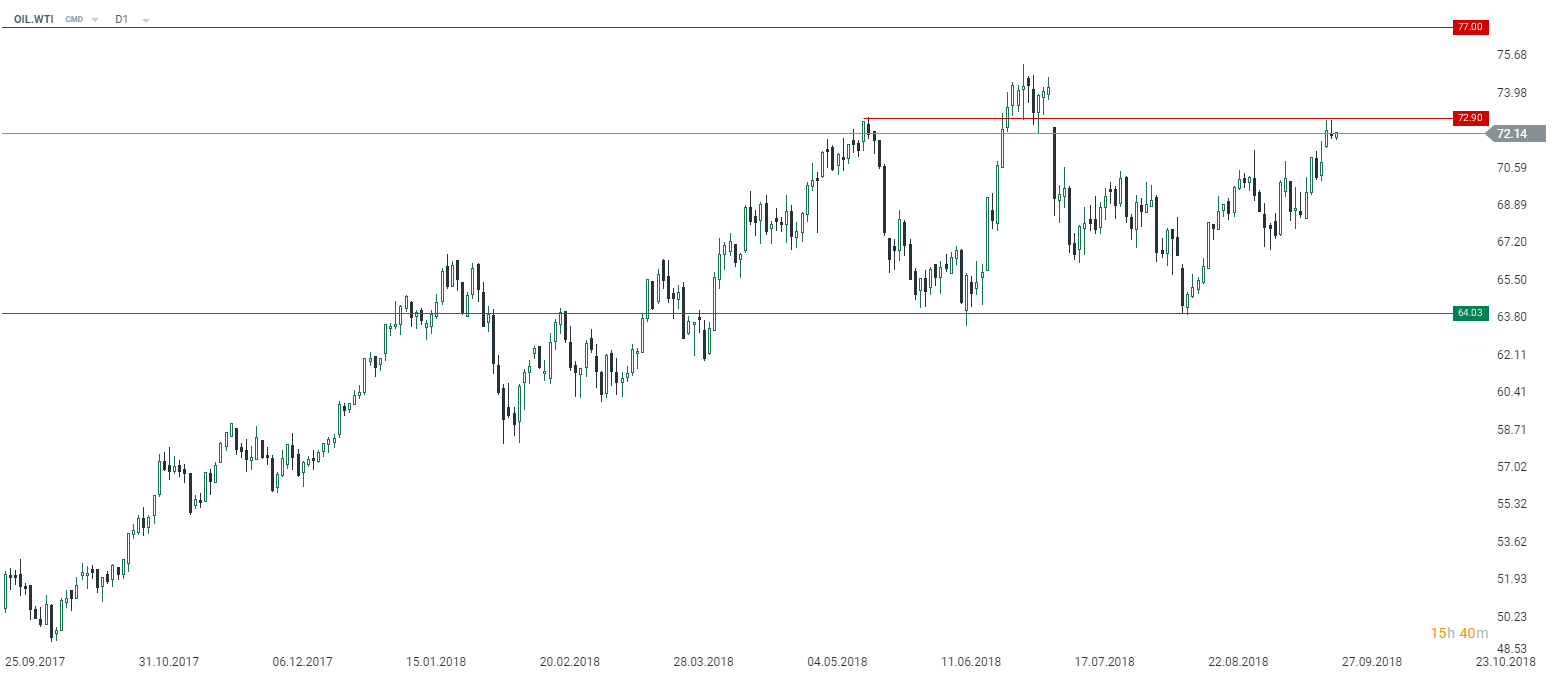 WTI prices are struggling just under $73 per barrel. Once they move through this level another target to eye will be $77. Source: xStation5