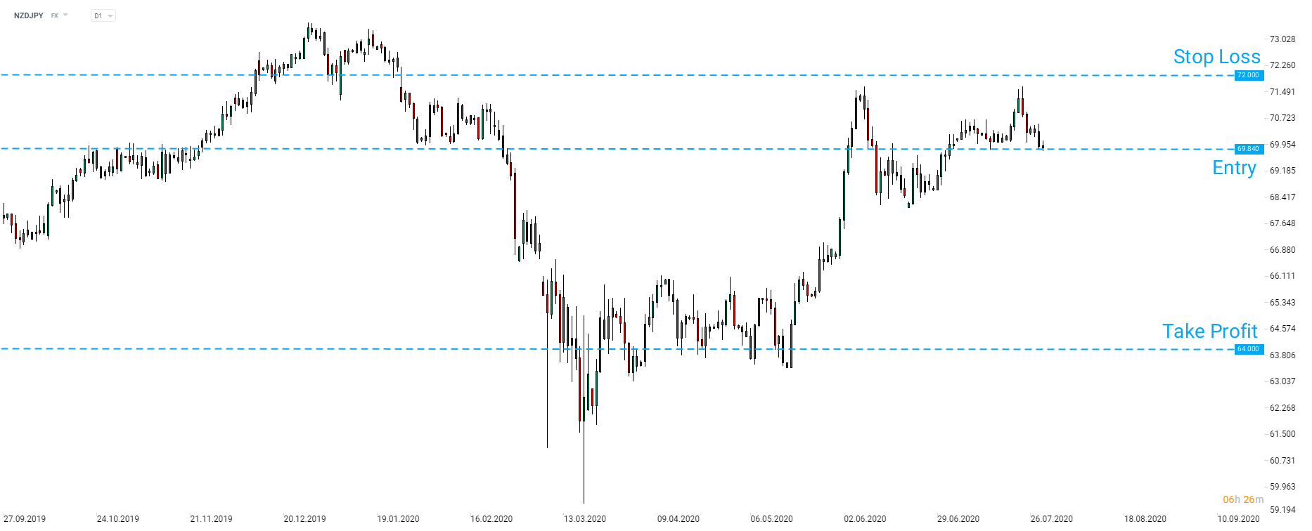 Societe Generale recommends taking a short position on NZDJPY at market price with a target of 64.00 and a stop loss order placed at 72.00. Source: xStation5