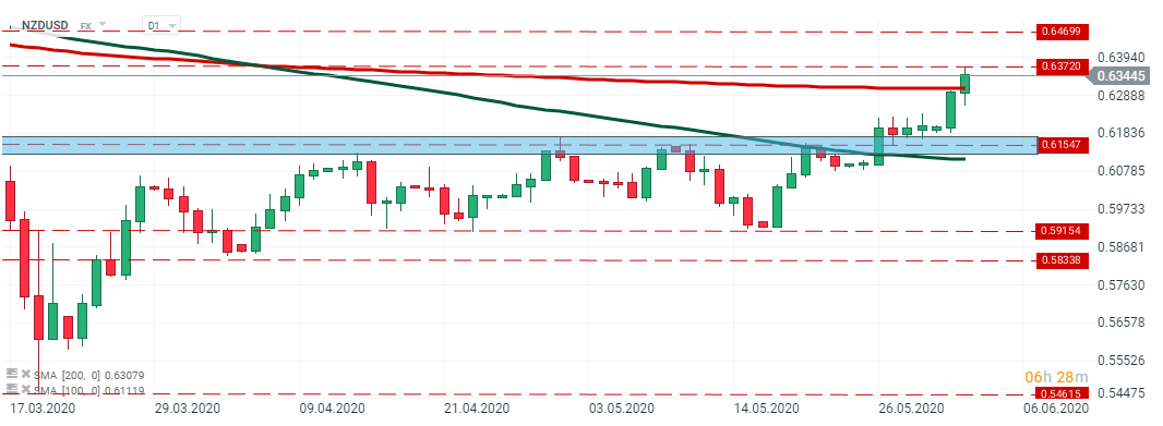 The NZDUSD is trading at a new session high and is one of the strongest currencies today. Currency pair broke above and is moving away from the 200 day MA (redline). Currently Kiwi is testing resistance at 0.6372. Should upbeat moods prevail, an upward impulse towards 0.6469 could be launched. On the other hand, once sellers regain control, the support at 0.6154 may be at risk.