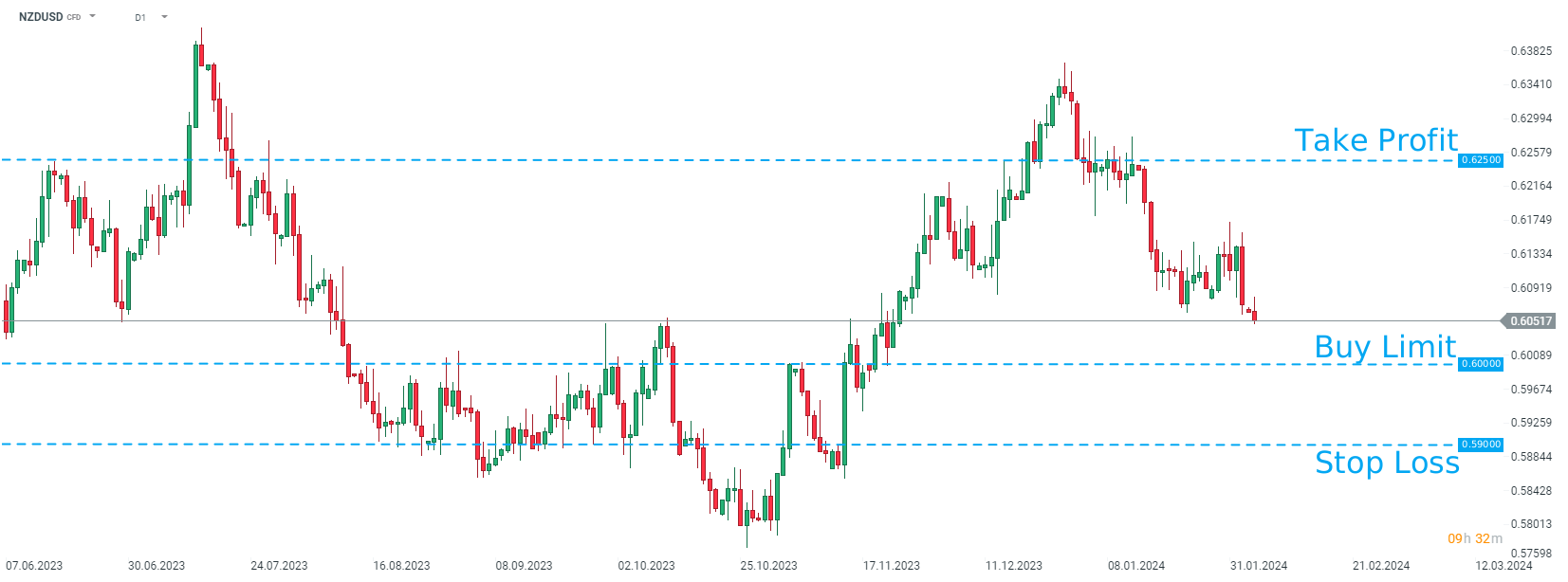 ANZ recommends taking a long pending position on NZDUSD with a limit order at 0.6000, a target of 0.6250 and a stop loss order placed at 0.5900. Source: xStation5