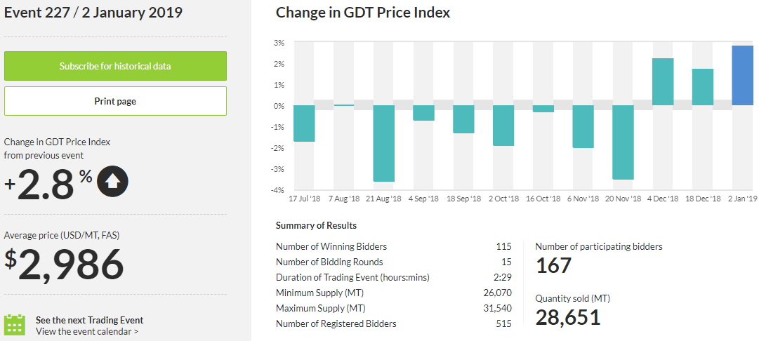 For the 3rd consecutive release, the GDT price index rose, with the gain of 2.8% the biggest in quite some time. Source: globaldairytrade.info