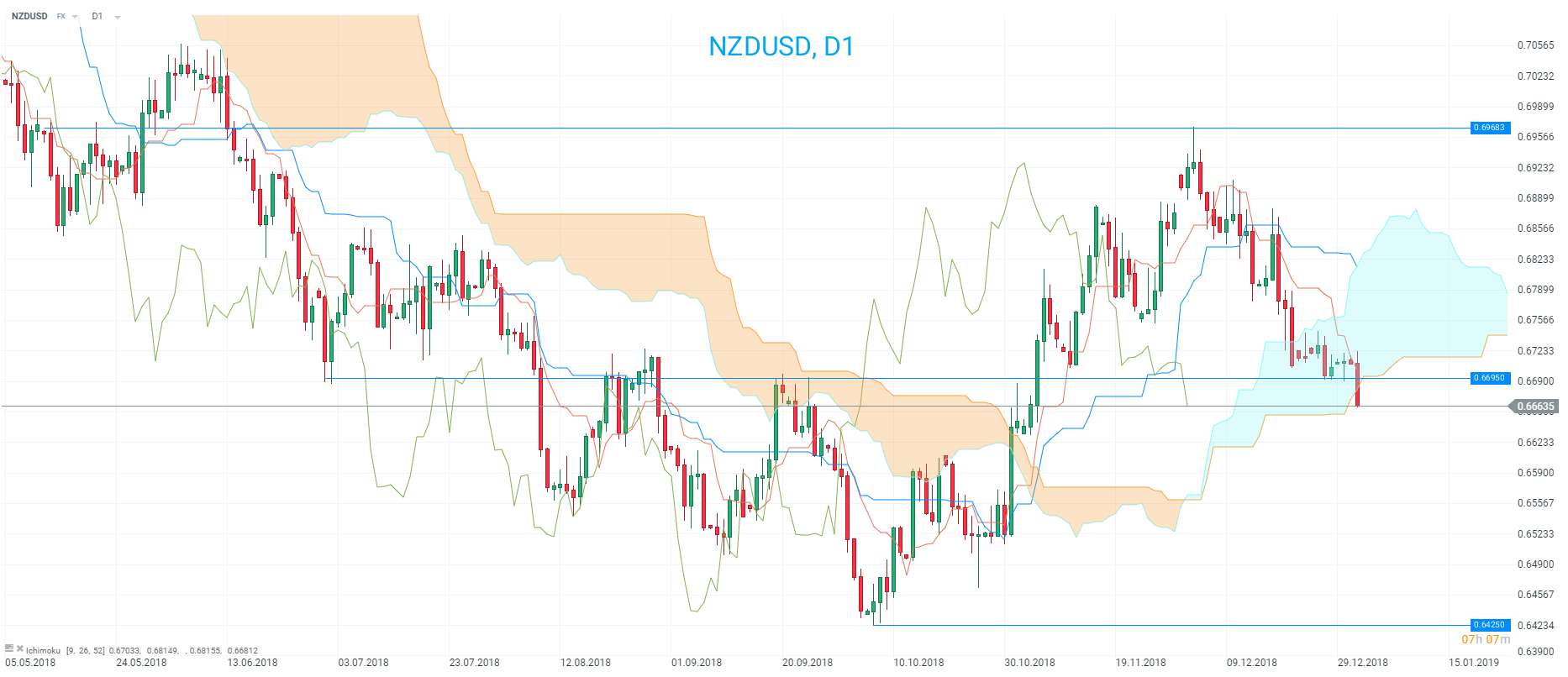 NZDUSD has moved below the D1 cloud and could seen to be moving into a downtrend. 0.6695 is a key line in the sand in the short term and if price remains below there on a daily closing basis then further declines may well lie ahead. Source: xStation