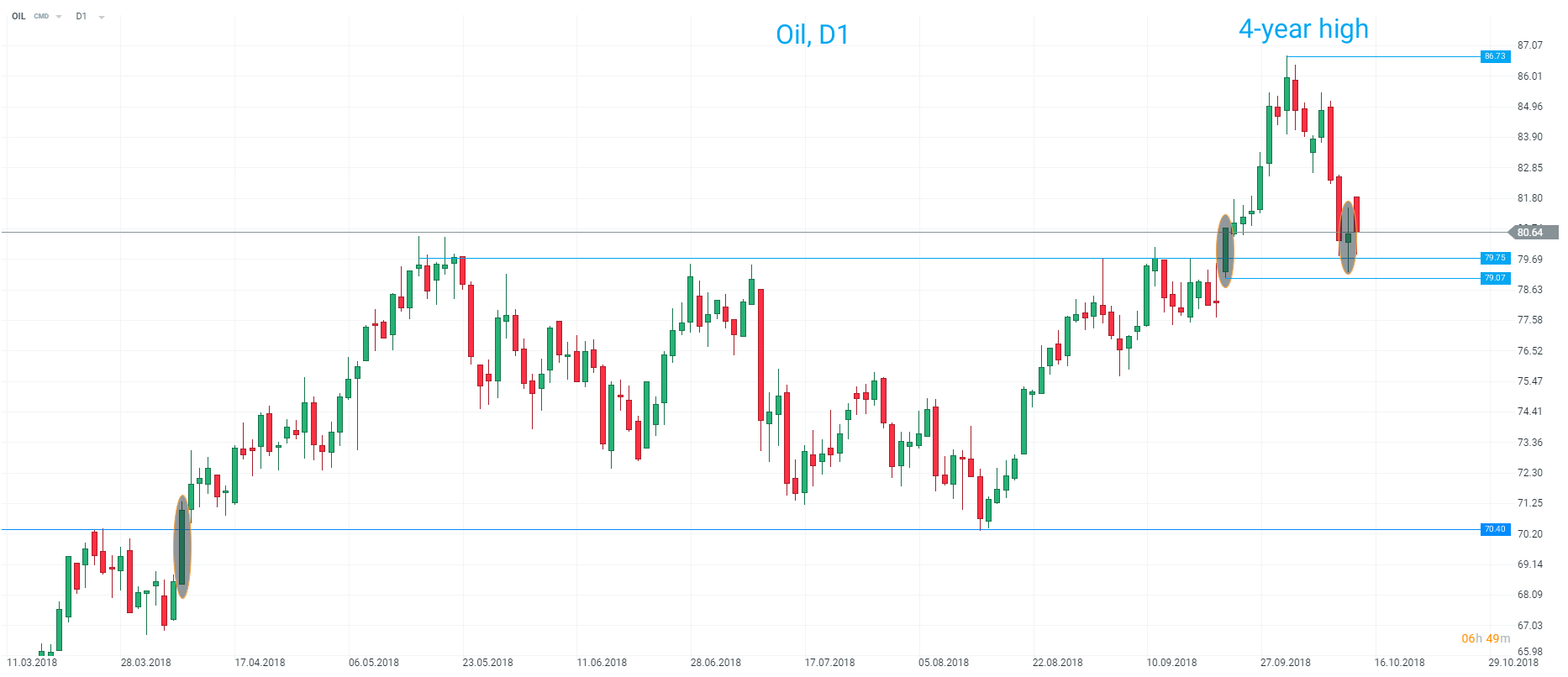 Oil has pulled back in recent session but importantly remains above the prior breakout level of 79.75 on a daily closing basis. Intraday price has dipped below here but failed to take out the last candle rule low at 79.07 from the day of the breakout. Source: xStation