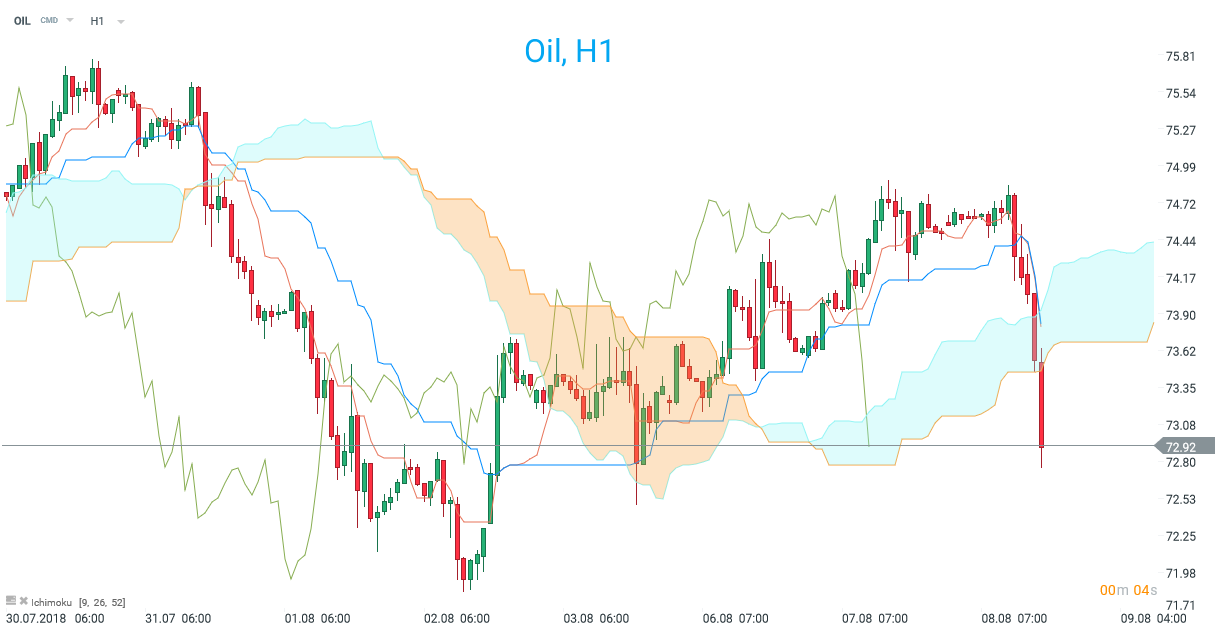 Oil has fallen below the H1 cloud since the release as the market reacts negatively to a smaller than expected drawdown. Source: xStation