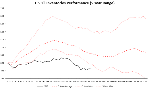 Despite today's smaller than expected drawdown, the reading represented another decline and compared to the past 5 years the inventory level in 2018 remains relatively far lower. Source: XTB Macrobond