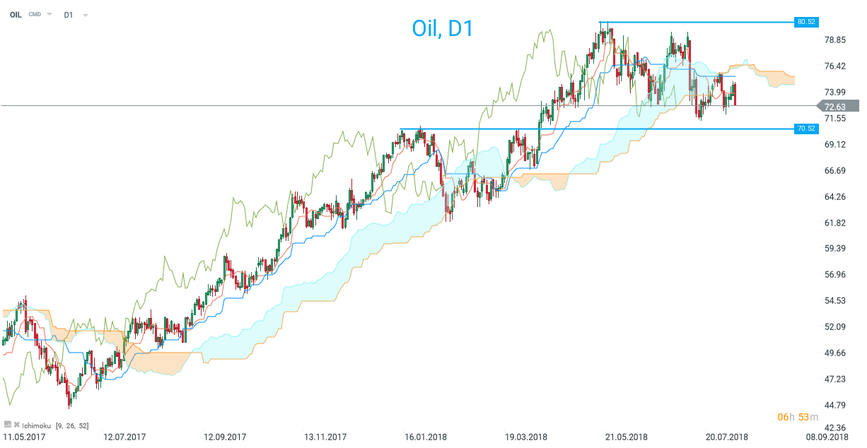 The longer term picture remains a little mixed for crude, with the market dropping below the cloud on D1 but the breakout level from 70.50 remains potentially important support. Source: xStation