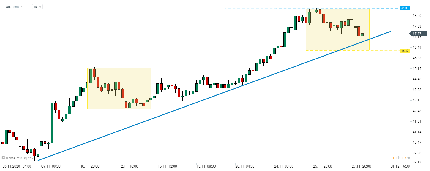 Brent (OIL) continues to pull back following a test of the $49 handle in the previous week. Oil traders are focused on whether current output cuts will be extended beyond January 2021 or will we see some of supply coming back next year. Source: xStation5