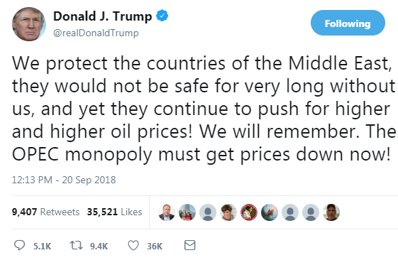Trump’s took to social media to voice his displeasure at the high oil price and called on OPEC to bring the market lower. Source: Twitter