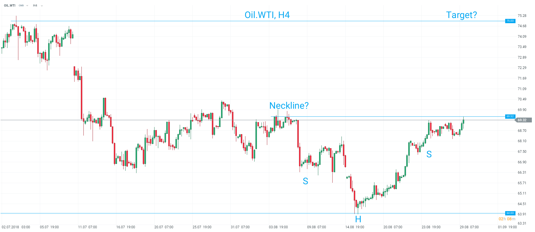 Oil.WTI is close to its highest level in a month after the release and the market could be setting up an inverse head and shoulders formation. The neckline in this could be seen to be around 69.50 which, if broken and it plays out in a textbook fashion would target a symmetrical move to 75.00. A rally of 550 ticks. Source: xStation