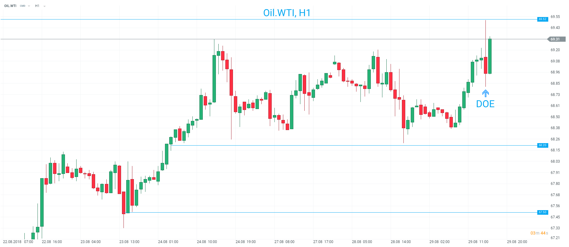 Oil.WTI spiked higher on the DOE release but by the time the H1 candle closed it was in the red. Price looks to remain pretty well supported and a break above 69.50 would negate the bearish H1 candle and could lead to a larger breakout. Source: xStation