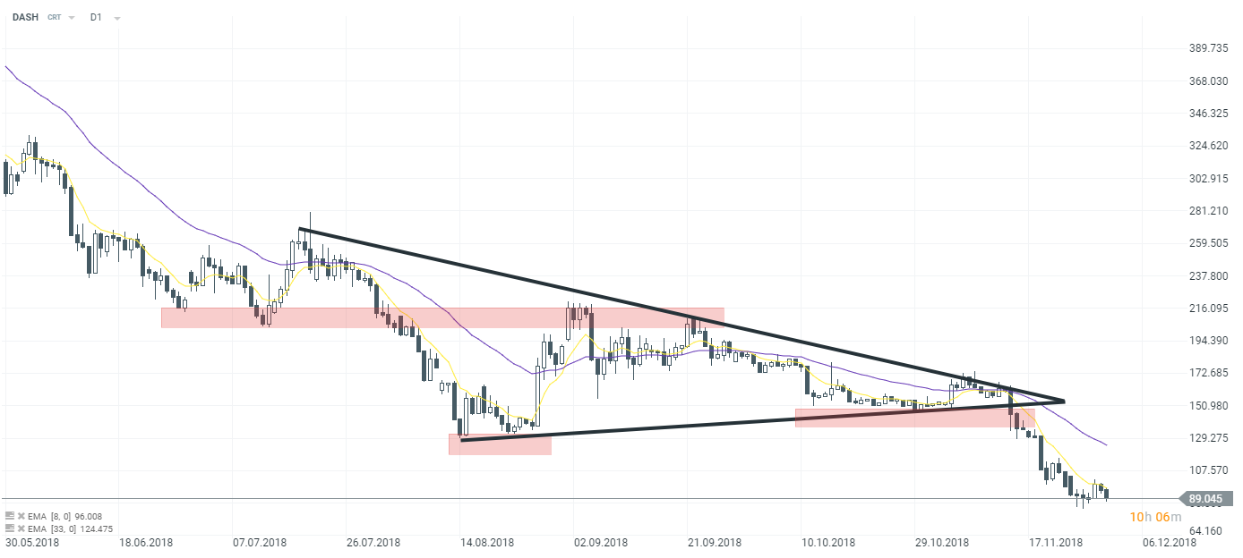 Dash (DASH on xStation5) declined below the $90 handle once again. As a result, the virtual currency is trading close to its recent lows. Source: xStation5