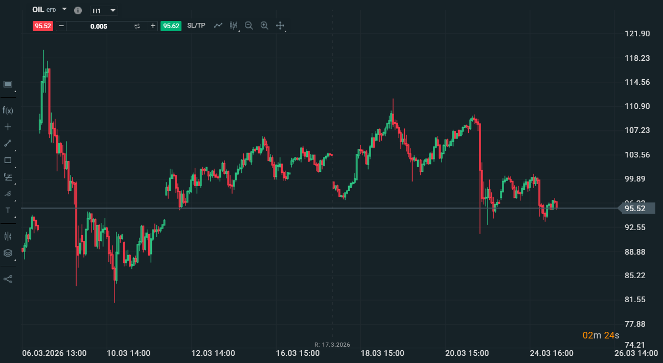 Oil prices have fallen nearly 4% since yesterday in response to renewed signals of possible de-escalation in the Middle East. The move took place toward the end of yesterday’s session, and today oil is holding at relatively stable levels with no major changes. At the time of writing, OIL is down 0.30% to 95 USD per barrel, and OIL.WTI to 88 USD per barrel.