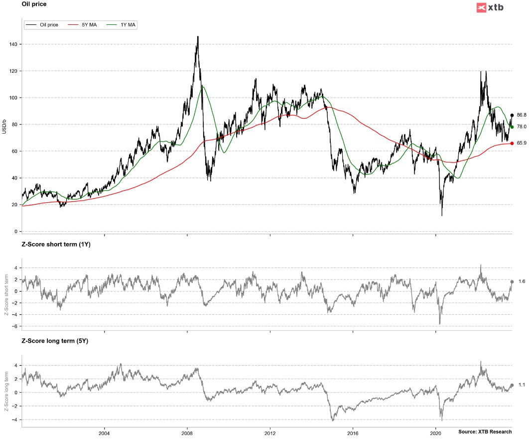 Until a few months ago, oil was strongly oversold relative to the short-term or long-term average. By contrast, we are now starting to see a slight overbought against the annual average (Z-Score 1Y). A break through this level could indicate a near-term local price peak. This could occur close to the USD 100 per barrel level. Source: Bloomberg Finance LP, XTB
