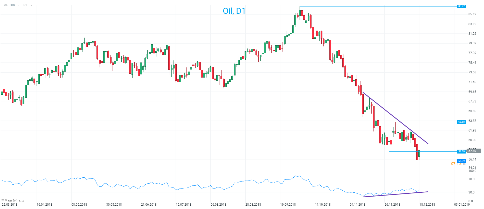 Oil has rallied today after the recent selling but price remains in a pretty clear downtrend. Positive divergence on the RSI could be seen as a positive for longs but for now the recovery appears to remain fragile. Source: xStation