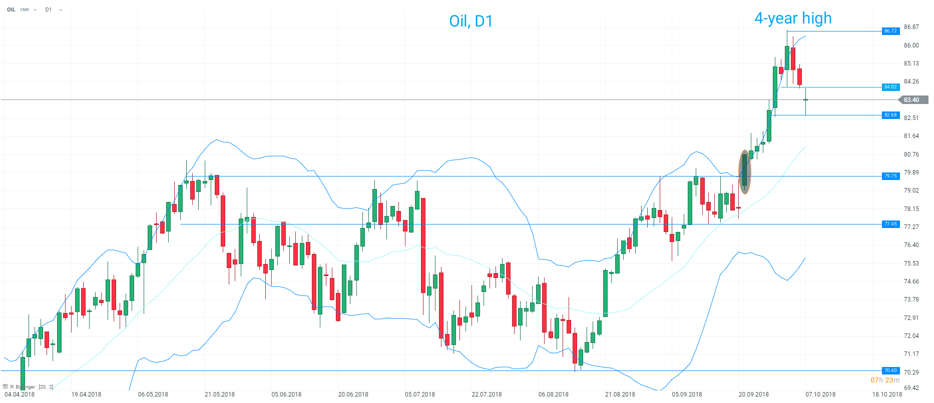 Oil has pulled back in recent sessions but still remains in a clear uptrend after breaking above 79.75 a couple of weeks back. The market has come off the upper Bollinger band but is still towards the upper reaches. Source: xStation