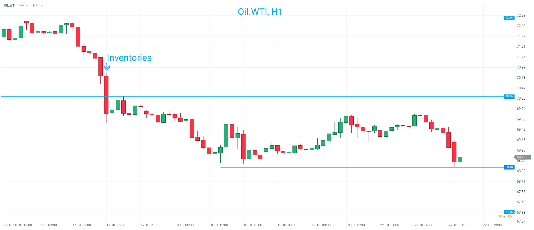 Oil.WTI has continued lower today, with price falling to a 1-month low of 68.48. Price remains under pressure due to the latest geopolitical situation and the recent build in US inventories. Source: xStation