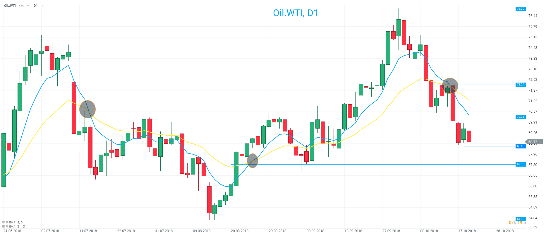 Oil.WTI is consolidating after recent declines but appears to be trending lower according to the EMAs. Source: xStation