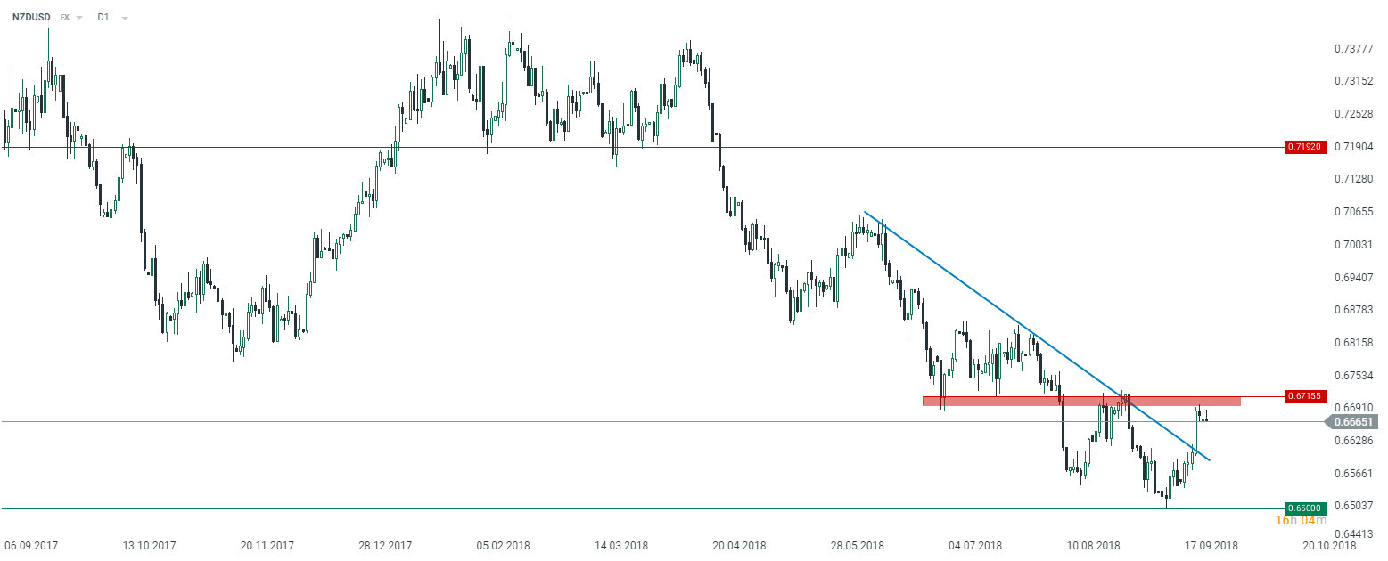 The NZ dollar is reversing from the important supply area placed nearby 0.67. Nevertheless, do notice that the price broke through the short-term trend line last week hence bulls may want to keep above this line. The Federal Reserve meeting on Wednesday could be a chance for them once the Fed disappoints markets. Source: xStation5