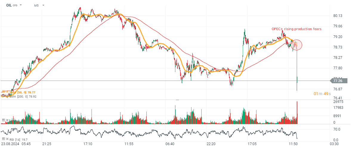 Brent Crude (OIL) loses more than 2% today, as six OPEC+ sources said that OPEC+ is likely to proceed with a planned gradual oil production increase, possible since October 2024. 8 OPEC+ members plan to increase oil production by 180 000 barrels per day, in October (as a part of the OPEC+ plan of slowing production cuts by 2.2 barrels per day), while all other cuts are expected to persist to the end of 2025 year.