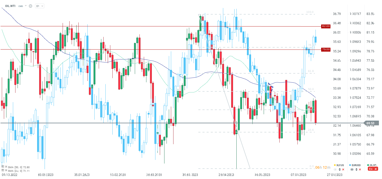 OIL.WTI is pulling back around 4% today in response to mixed DOE report and hawkish actions of central banks. Source: xStation5
