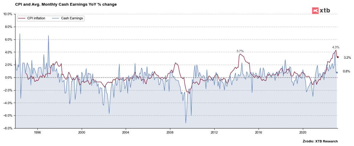 Monthly earnings in annual growth - here we see a marked decline in the last month, but previously the pace suggested a positive impact on inflation. The wage negotiations should contribute to the strong growth in monthly wages again. Source: Bloomberg, XTB