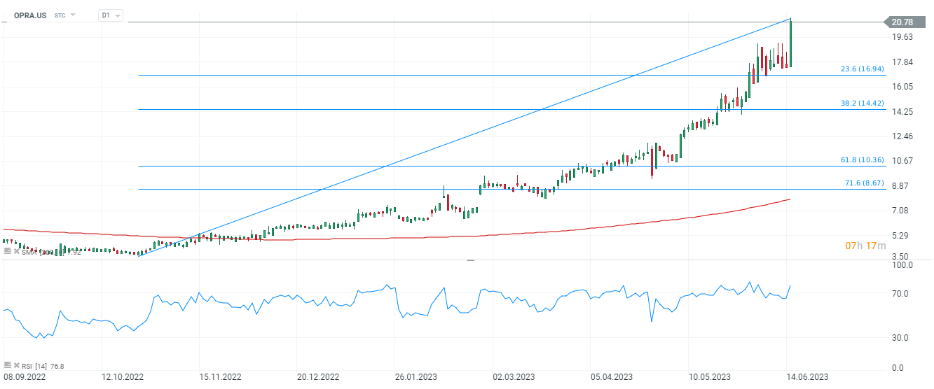 Opera (OPRA.US) shares, D1 interval. The main support level in case of a correction is at $17 per share where we see the 23.6 abolition of the upward wave from the fall of 2022. Source: xStation5