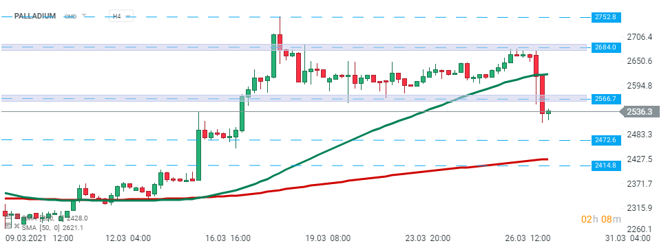 Palladium has been trading in a sideways move recently. Today the price broke below the 50 SMA (green line) and the lower limit of consolidation range at $2566.7 If sellers manage to uphold momentum, then downward move could be extended to the support at $2472.6 or even 2414.8 which coincides with 200 SMA (red line). Source: xStation5