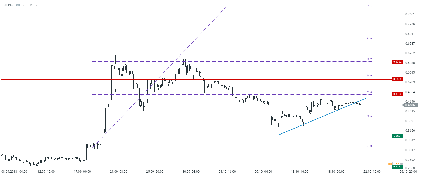 RIPPLE is fluctuating just slightly above the price levels seen on Friday. The price is currently moving below the short-term trend line. If a corrective move occurs, one may count on an extended pullback toward the 78.6% retracement. The nearest resistance might be found in the vicinity of the 61.8% retracement or $0.49. Source: xStation5
