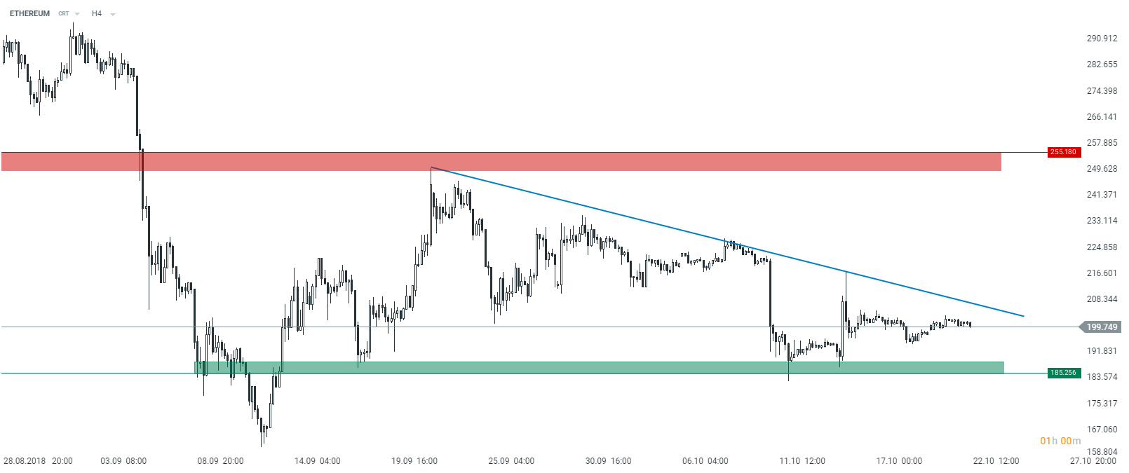 ETHEREUM, like other major coins, has been moving flat recently. The virtual currency is trading around the $200 handle. Source: xStation5