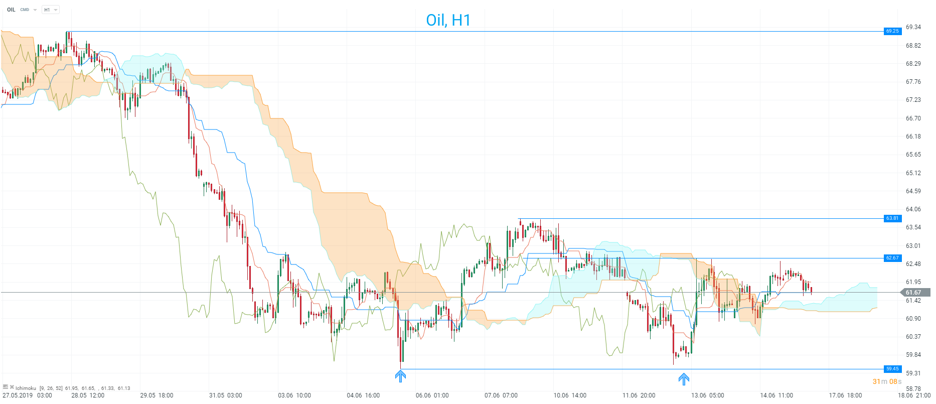 Oil is drifting lower this morning but a double bottom around 59.45 remains in play. Price is now back above the H1 Ichimoku cloud with 62.65 seen as possible resistance. Source: xStation