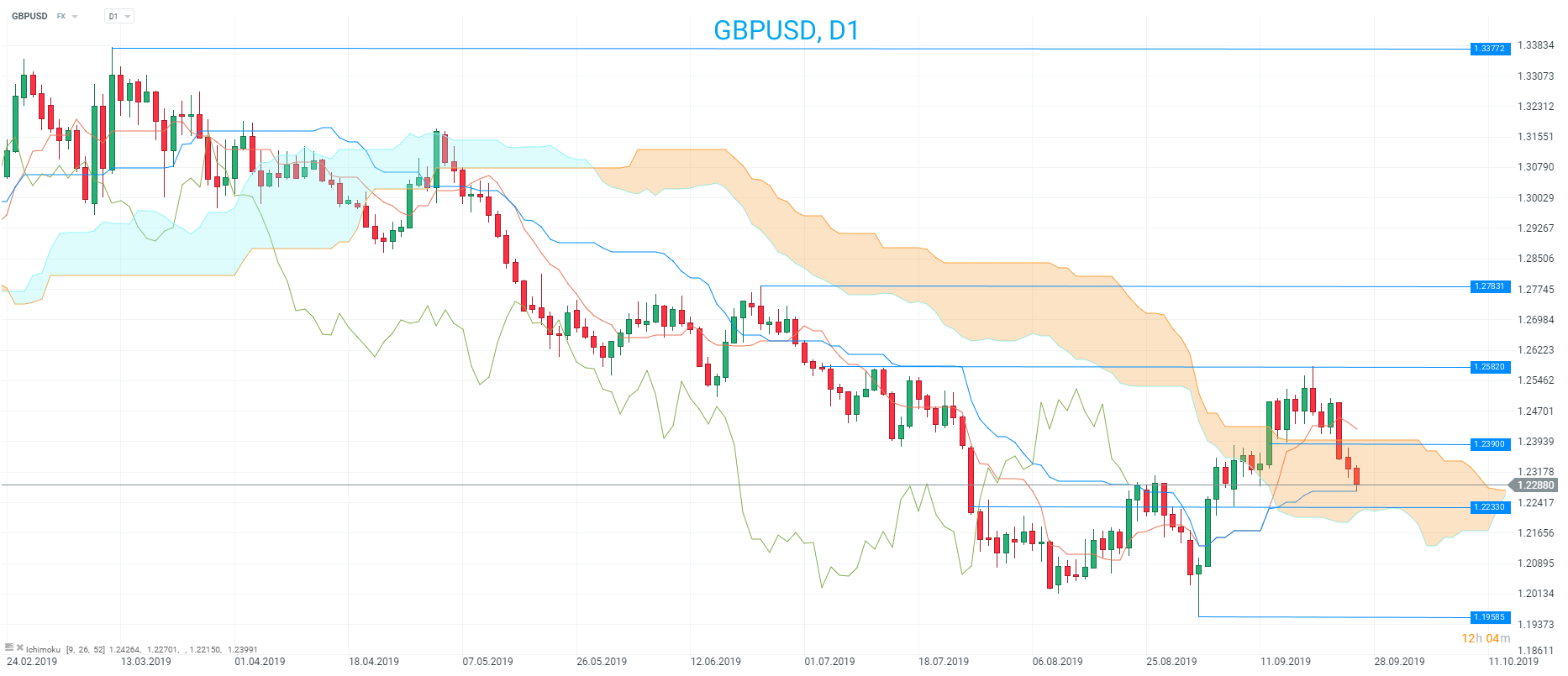 The GBPUSD rate is on track for a 3rd consecutive day of losses with price pulling back into the Ichimoku cloud on D1. The low of the cloud around 1.2230 roughly coincides with prior support and could be a level to keep an eye on if price falls further. Source: xStation