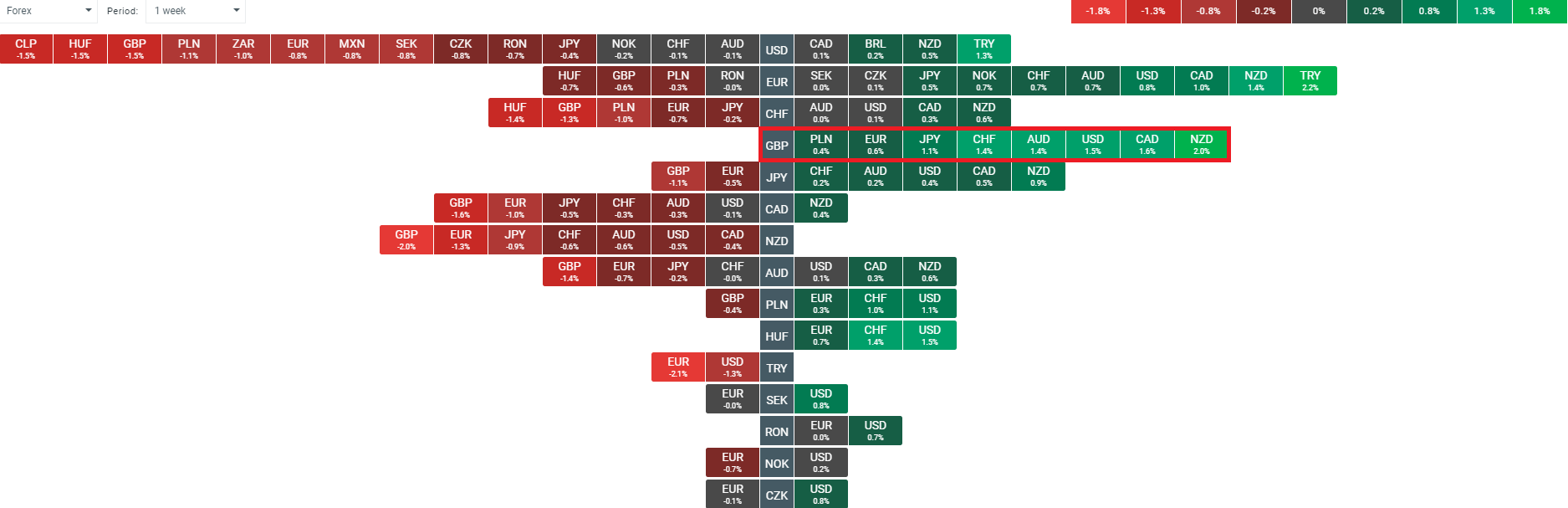 The pound is trading lower on the week with the largest loss seen against the Kiwi and the Loonie. Source: xStation