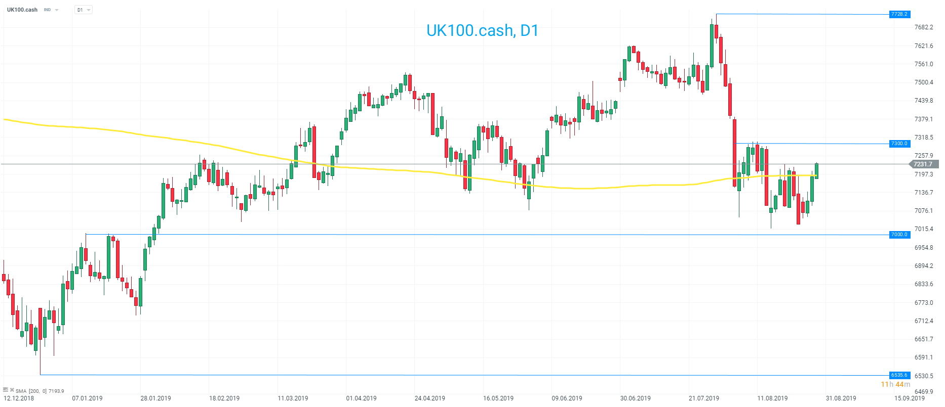 UK stocks are trading higher for the 3rd day in a row. The FTSE continues to oscillate around the 200 day SMA with support seen around 7000 and resistance 7300. Source: xStation
